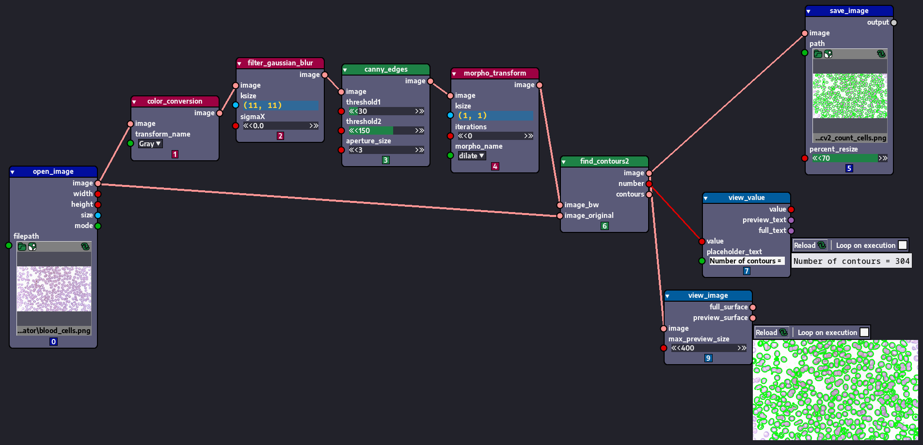 pip install nodezator(this will install nodezator and its dependencies: pygame-ce and numpy)pip install opencv-python(so you can load/use the the node pack, since it relies on Python OpenCV)Here's one example image of a graph demonstrating finding contours of blood cells and counting them: