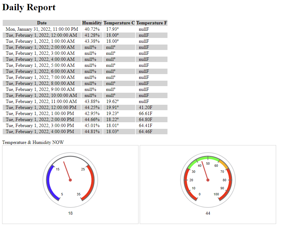 The last part of the pipeline is to send the ThingSpeak data to a web panel. I did this with Javascript and HTML. It is not very complicated right now, it simply shows a daily report with the averages per hour. Async functions are still a bit complicated for me so I was not able to really figure out how to change the parameters without creating a lot of files of the same script but with a different url. I hope to create options in the future where you can select different timeframes etc. A daily report won't be enough to get insights but once there are enough datapoints we can create monthly reports and charts to get a better picture, as well as seeing the correlation of the temperature and humidity. I also hope to get rid of the 'null' values someday, I was not able to figure that out unfortunately, but that's also due to the fact that the channel is new and that the device didn't run at night. The script I used for the API call is in script.js