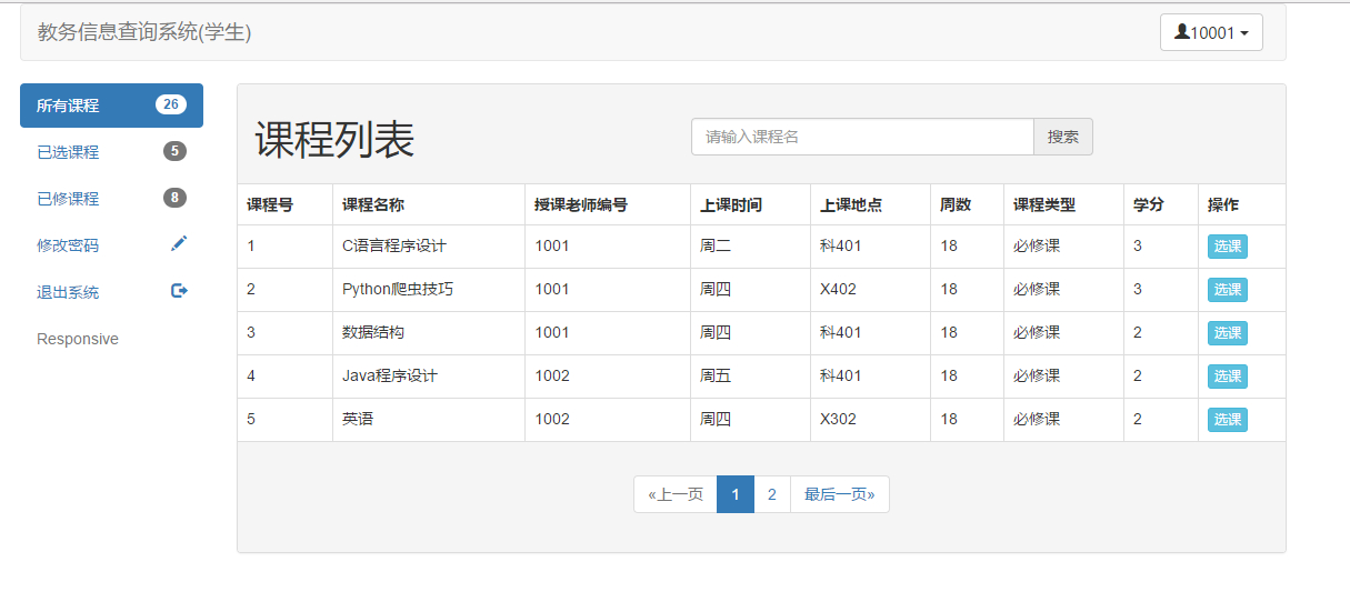 学生登录后,根据学生信息,获取其已经选择的课程,和已经修完的课程