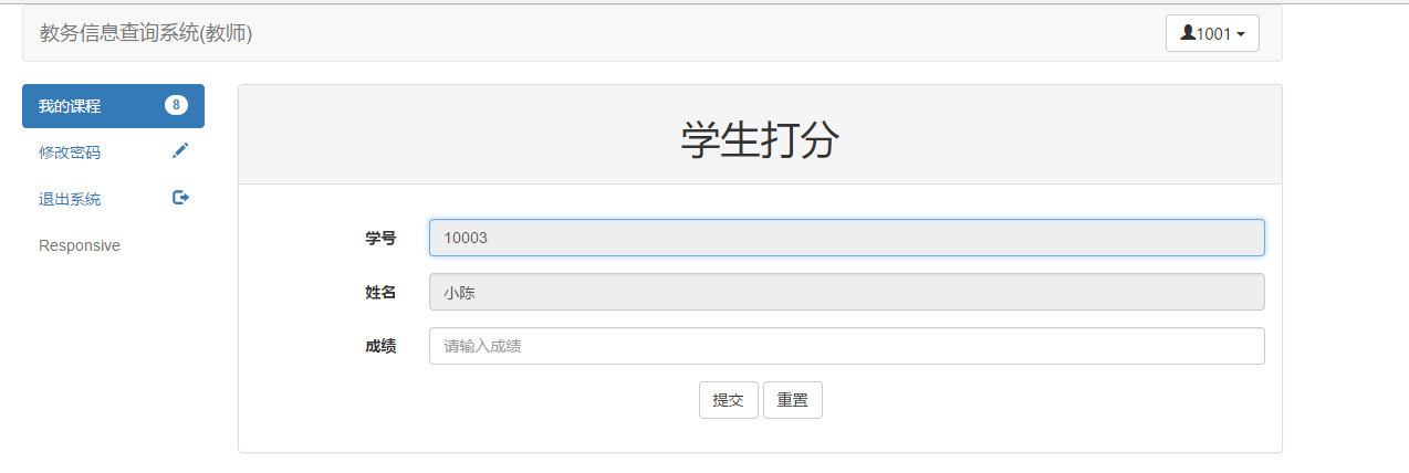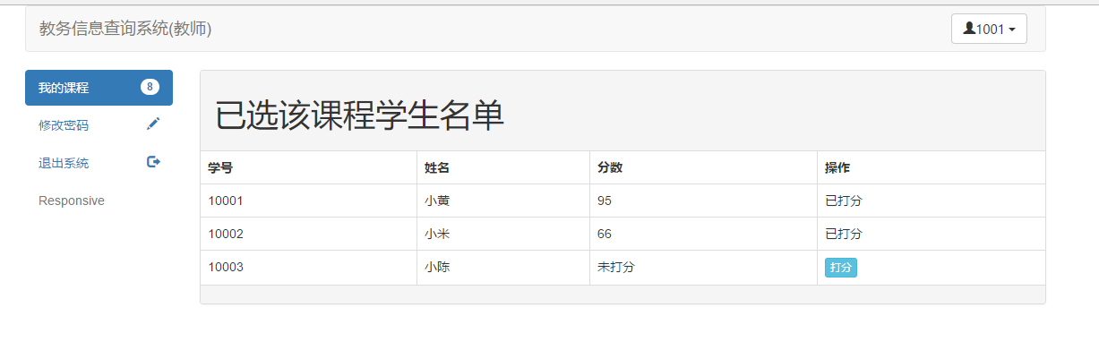 教师登陆后,可以获取其,教授的课程列表,并可以给已经选择该课程的同学打分,无法对已经给完分的同学进行二次操作