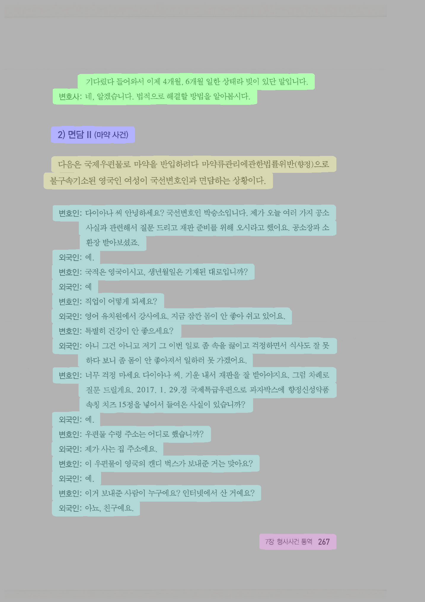 block line text 1 1 기다렸다 들어와서 이제 4개월, 6개월 일한 상태라 빚이 있단 말입니다. 1 2 변호사: 네, 알겠습니다. 법적으로 해결할 방법을 알아봅시다. 2 3 2) 면담 Ⅱ (마약 사건) 3 4 다음은 국제우편물로 마약을 반입하려다 마약류관리에관한법률위반(향정)으로 3 5 불구속기소된 영국인 여성이 국선변호인과 면담하는 상황이다. 4 6 변호인: 다이아나 씨 안녕하세요? 국선변호인 박승소입니다. 제가 오늘 여러 가지 공소 4 7 사실과 관련해서 질문 드리고 재판 준비를 위해 오시라고 했어요. 공소장과 소 4 8 환장 받아보셨죠. 4 9 외국인: 예. 4 10 변호인: 국적은 영국이시고, 생년월일은 기재된 대로입니까? 4 11 외국인: 예 4 12 변호인: 직업이 어떻게 되세요? 4 13 외국인: 영어 유치원에서 강사에요. 지금 잠깐 몸이 안 좋아 쉬고 있어요. 4 14 변호인: 특별히 건강이 안 좋으세요? 4 15 외국인: 아니 그건 아니고 저기 그 이번 일로 좀 속을 끓이고 걱정하면서 식사도 잘 못 4 16 하다 보니 좀 몸이 안 좋아져서 일하러 못 가겠어요. 4 17 변호인: 너무 걱정 마세요 다이아나 씨. 기운 내서 재판을 잘 받아야지요. 그럼 차례로 4 18 질문 드릴게요. 2017. 1. 29.경 국제특급우편으로 과자박스에 향정신성약품 4 19 속칭 치즈 15정을 넣어서 들여온 사실이 있습니까? 4 20 외국인: 예. 4 21 변호인: 우편물 수령 주소는 어디로 했습니까? 4 22 외국인: 제가 사는 집 주소에요. 4 23 변호인: 이 우편물이 영국의 캔디 벅스가 보내준 거는 맞아요? 4 24 외국인: 예. 4 25 변호인: 이거 보내준 사람이 누구에요? 인터넷에서 산 거예요? 4 26 외국인: 아뇨, 친구예요. 5 27 7장 형사사건 통역 267