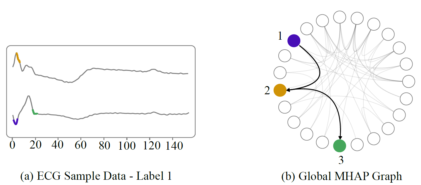This example demonstrates the MHAP evolution graph for ECG data and the temporal transitions for a Class 1 data set sample. The framework identifies the important subsequences of the multivariate time series data and represents the temporal transition through the MHAP evolution graph. Figure (a) shows the three MHAPs extracted from the class 1 sample that serve as nodes in the graph shown in (b). The transitions between the nodes show the order of occurrence of the MHAPs in the input data. To understand the decision of the network in classifying time series, our framework relies on the important subsequences of the input data (MHAPs) and their temporal order, which is crucial. For instance, when interpreting ECG data, a physician needs to examine the data in a specific temporal sequence to determine whether the patient's ECG recording is normal or has pathological problems.