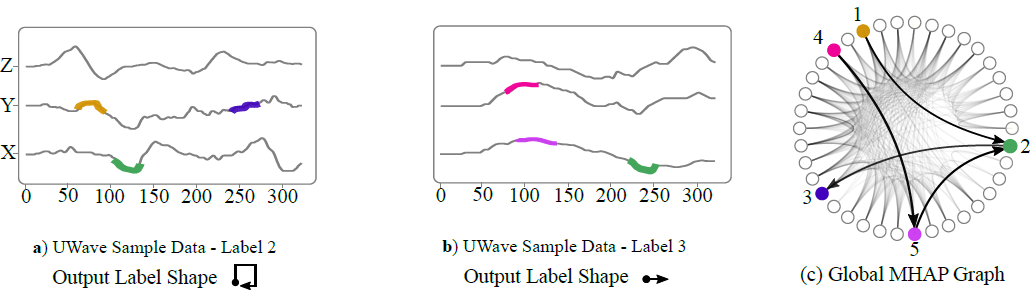 Our framework is tested on two samples from the UWave dataset, as shown in this example. The first sample (a) includes three representative patterns (nodes 1, 2, and 3) that were learned from the network, while the second sample (b) consists of representative MHAP nodes 4, 5, and 2. The graph represents the relationship between these nodes based on their temporal occurrence order in (c). Notably, node 2 is present in both samples, but its temporal order is different in the two classes. Our graph representation plays a crucial role in identifying the representative patterns and their chronological order, aiding the classifier in making a specific decision.