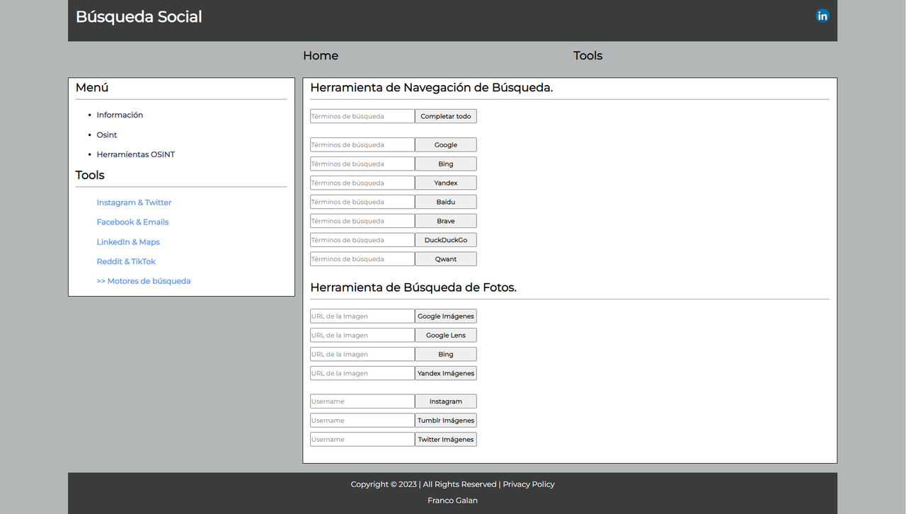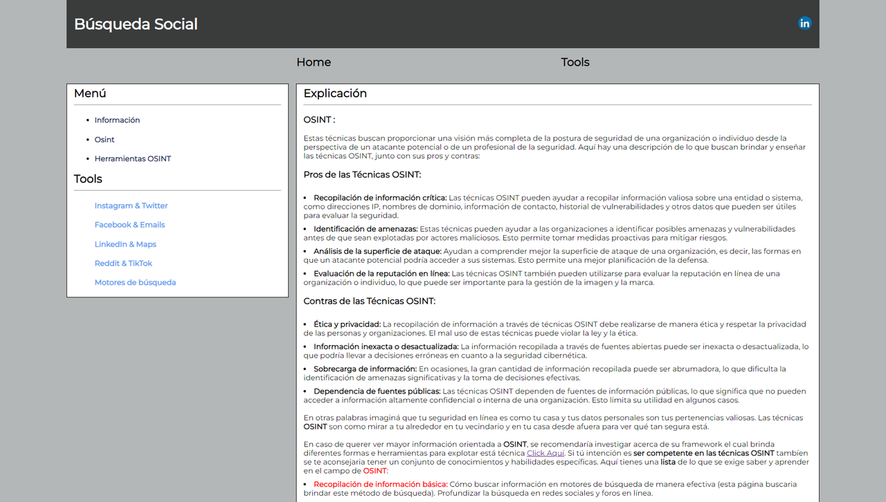 Esta herramienta fue desarrollada con un fín totalmente educativo y de repaso hacia la metodología de una Herramienta OSINT.