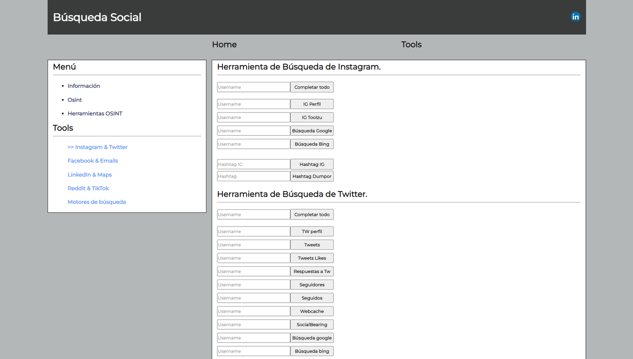 - Hay además dentro de este sitio varios formularios para encontrar información en diversos sitios como por ejemplo, LinkedIn, Facebook , Reddit, motores de búsqueda y entre otros..