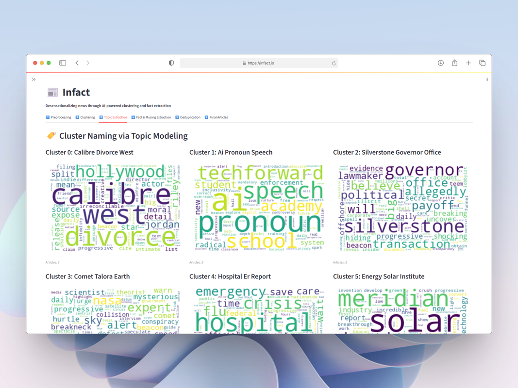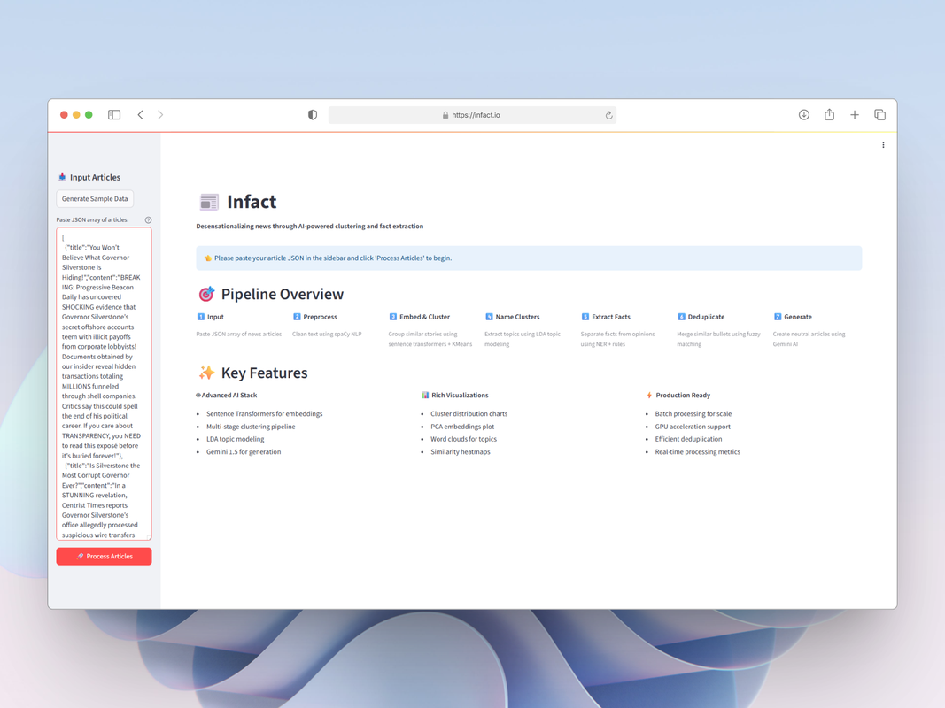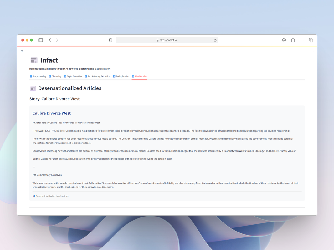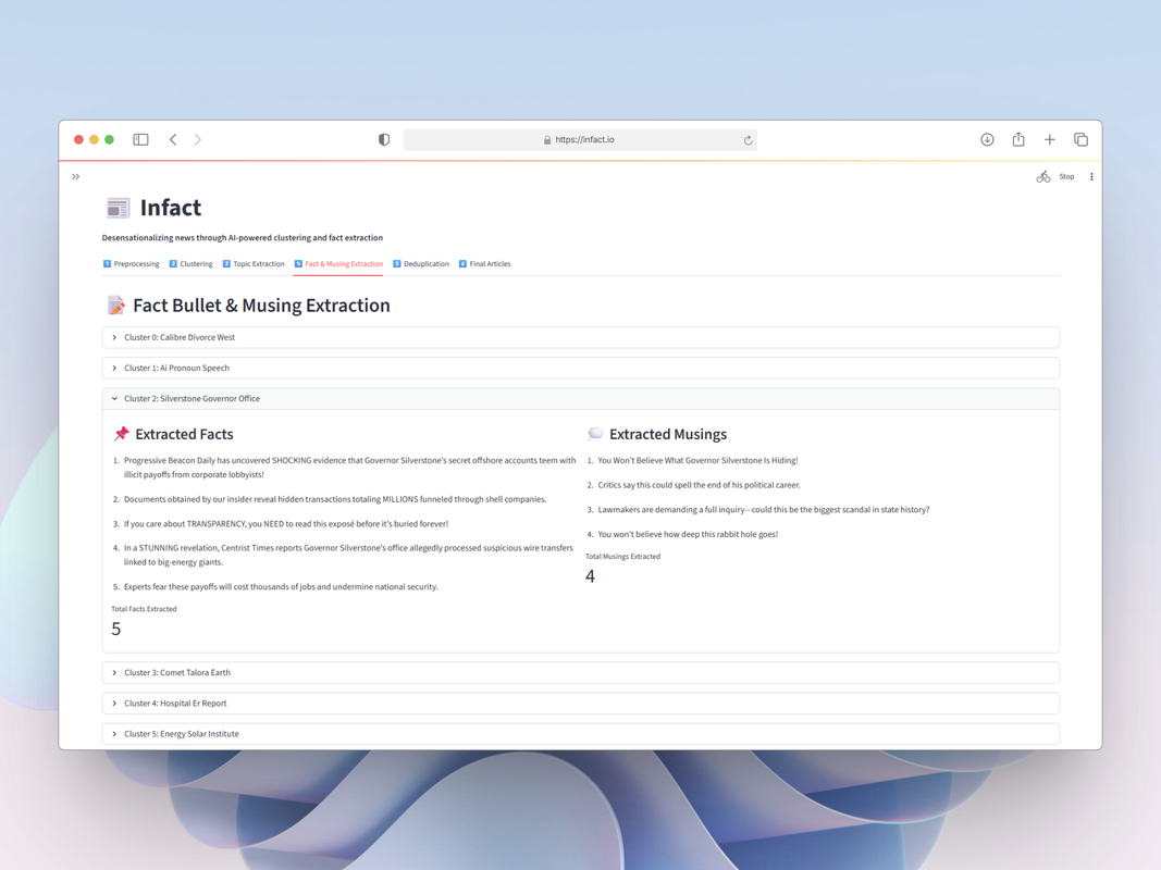 Infact demonstrates an intelligent news processing pipeline that takes sensationalized articles and transforms them into factual, neutral reporting. The system clusters similar stories, extracts key facts, removes editorial bias, and generates clean, informative articles.
