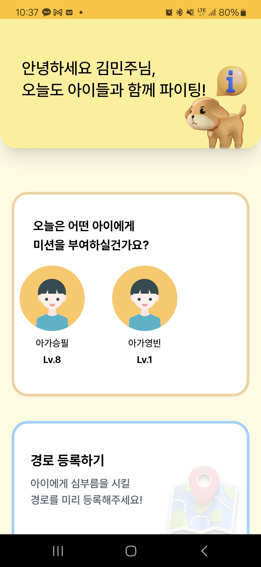 - 아이는 미션을 수행하며 경험치를 얻고, 레벨업을 통해 동물 캐릭터를 뽑을 수 있습니다.