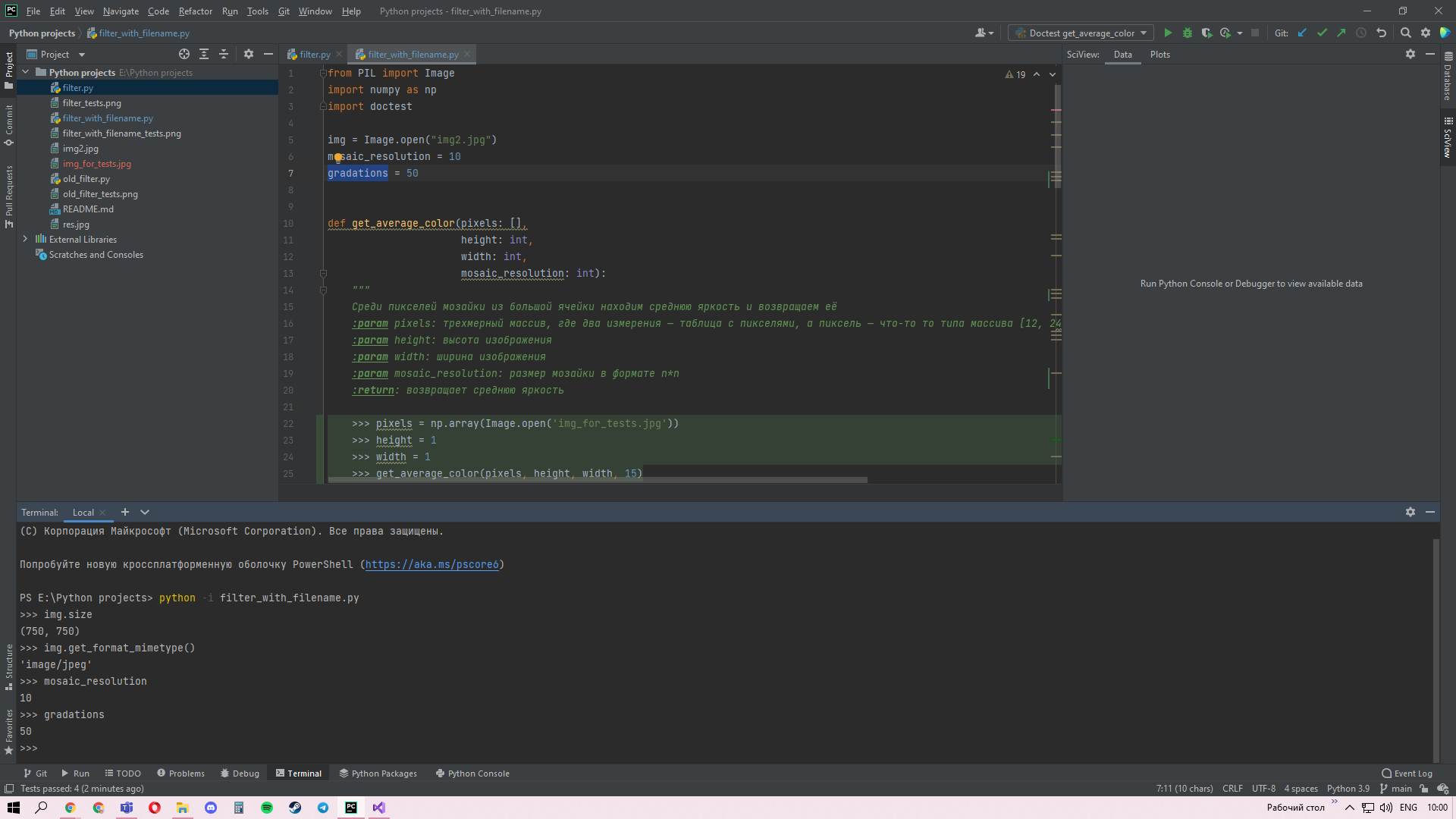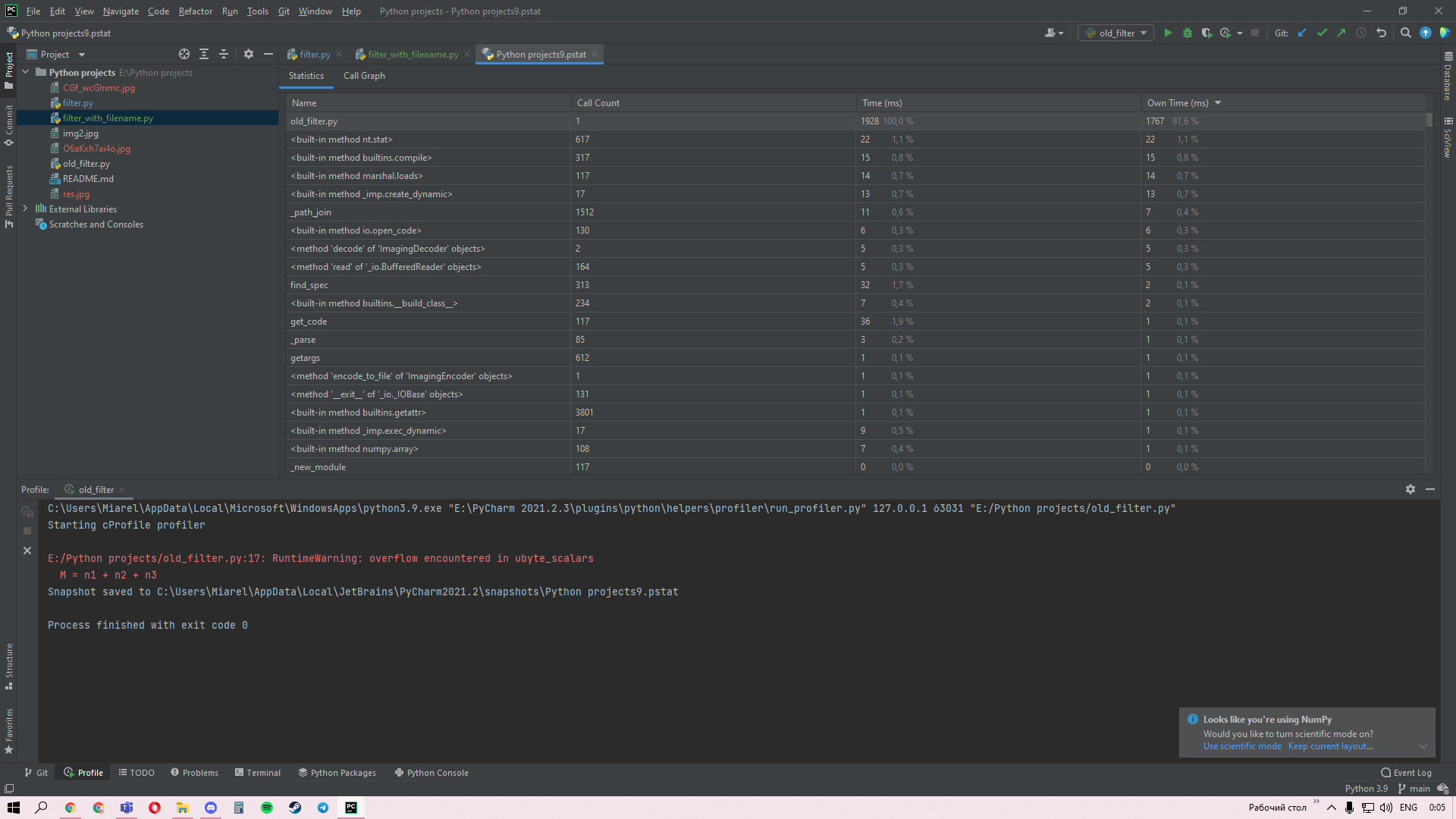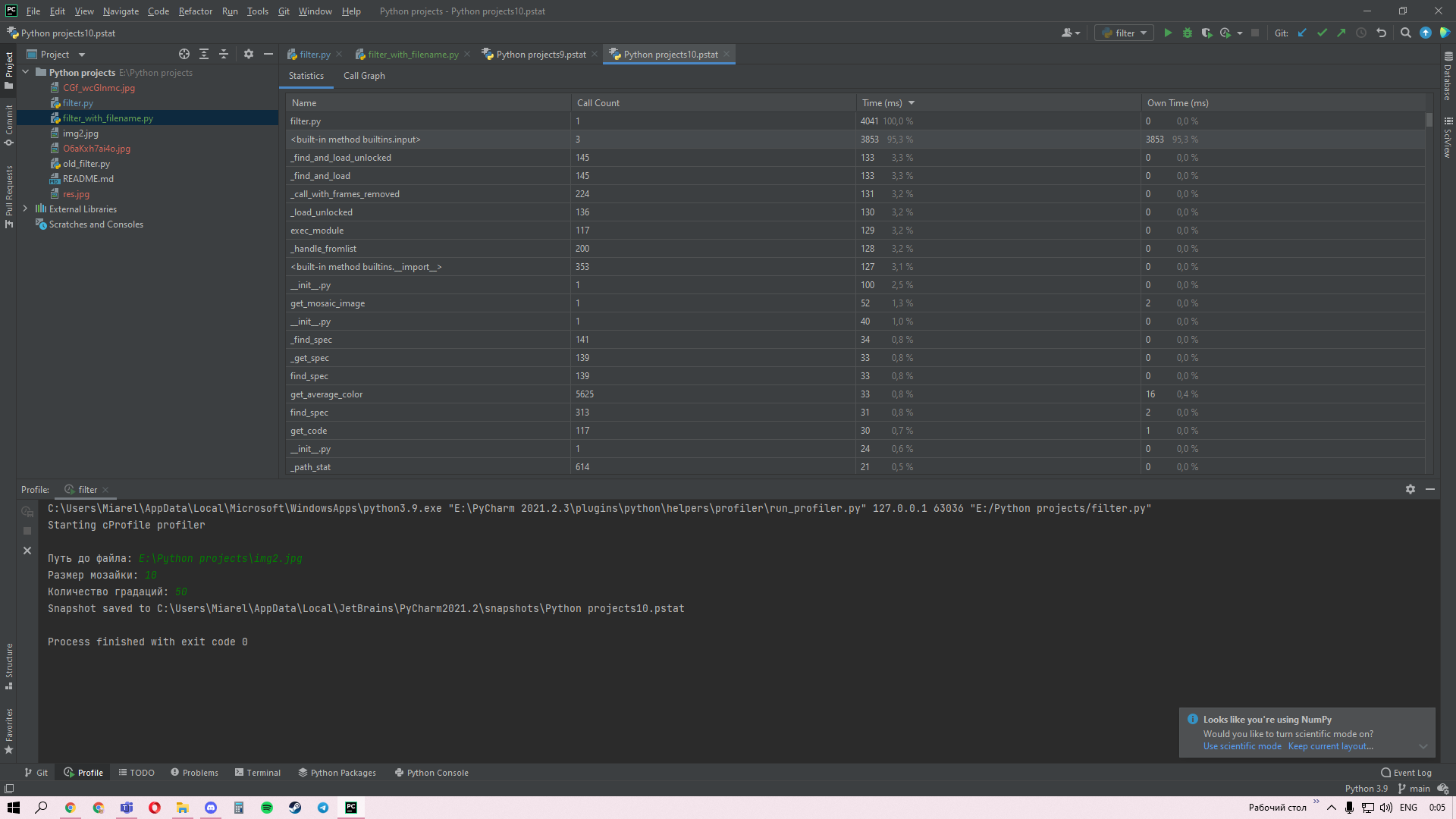 Время выполнения filter.py и filter_with_filename.py различаются из-за того, что мы не тратим время на ввод данных и отличается от old_filter.py из-за замены циклов.