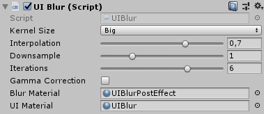 Just add UIBlur.cs script to Camera and attach UIBlurPostEffect and UIBlur material to it.