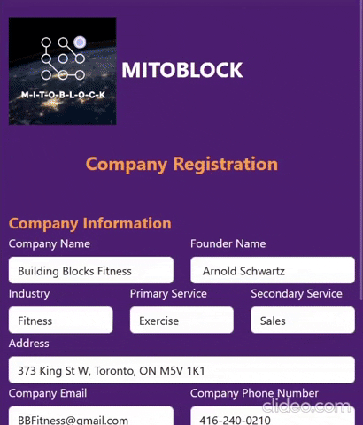 This web app is used by representatives of startups or small businesses who are interested in joining our MitoBlock network. They will have to fill out the form by providing us their company information (contact information, industry, number of users, revenue, etc.) and business needs such as how they will use our service or if they will use smart contracts. After submitting this form, an email is generated and sent to one of our team members.