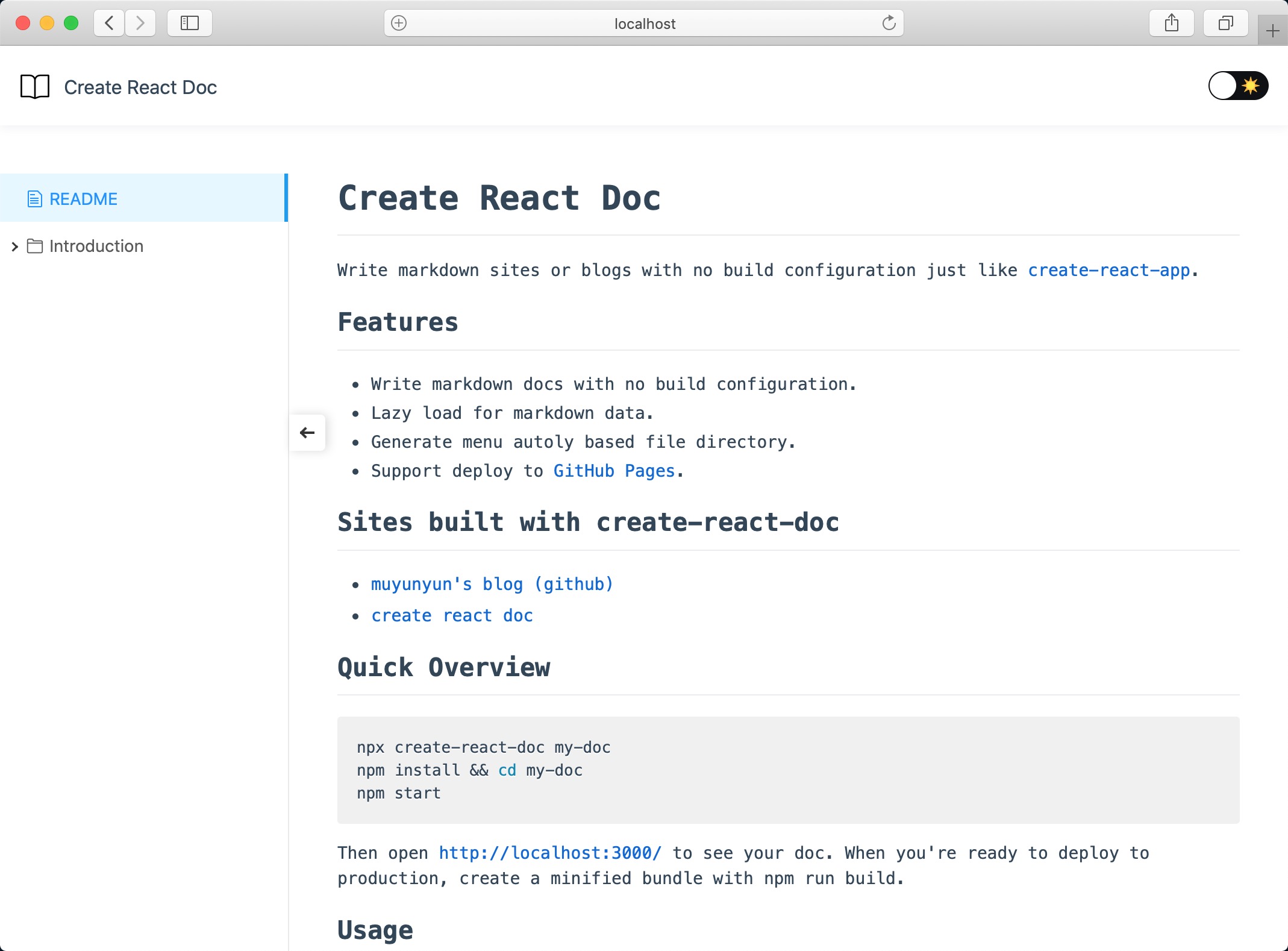 Create React Doc 是一个使用 React 的 markdown 文档站点生成工具。就像 create-react-app 一样,开发者可以使用 Create React Doc 来开发、部署文档或者博客站点而无需关心额外的环境配置信息。