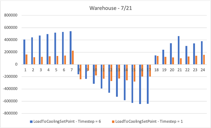 When zone volume is large, the air energy storage term is a large portion of the predicted system load, and the load calculation is less accurate when using longer time steps (e.g. 1 hour). For example, for RefBldgWarehouseNew_Chicago.idf model, the design day cooling load shows a 3X difference when using 1 hour and 10 min time steps for the BulkStorage zone as the below figures show.