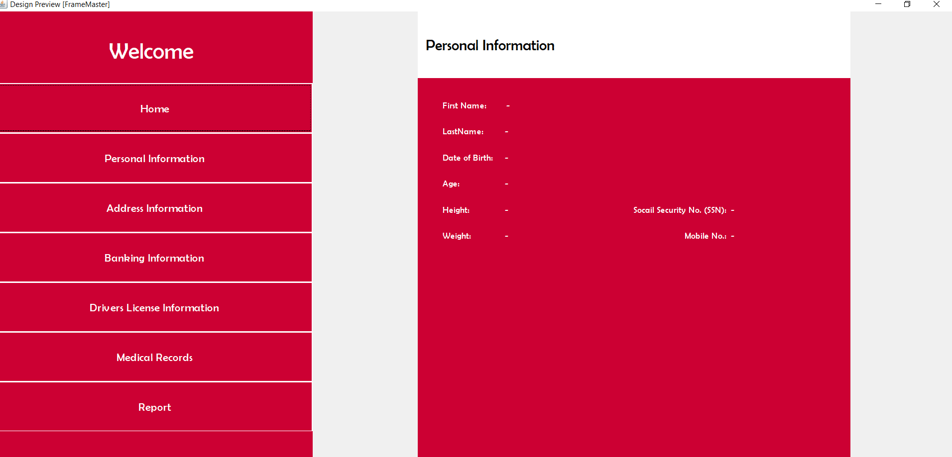 | Pesronal Information | Information Such as first name, last name, phone number, date of birth, age, height, weight, social security number. |
