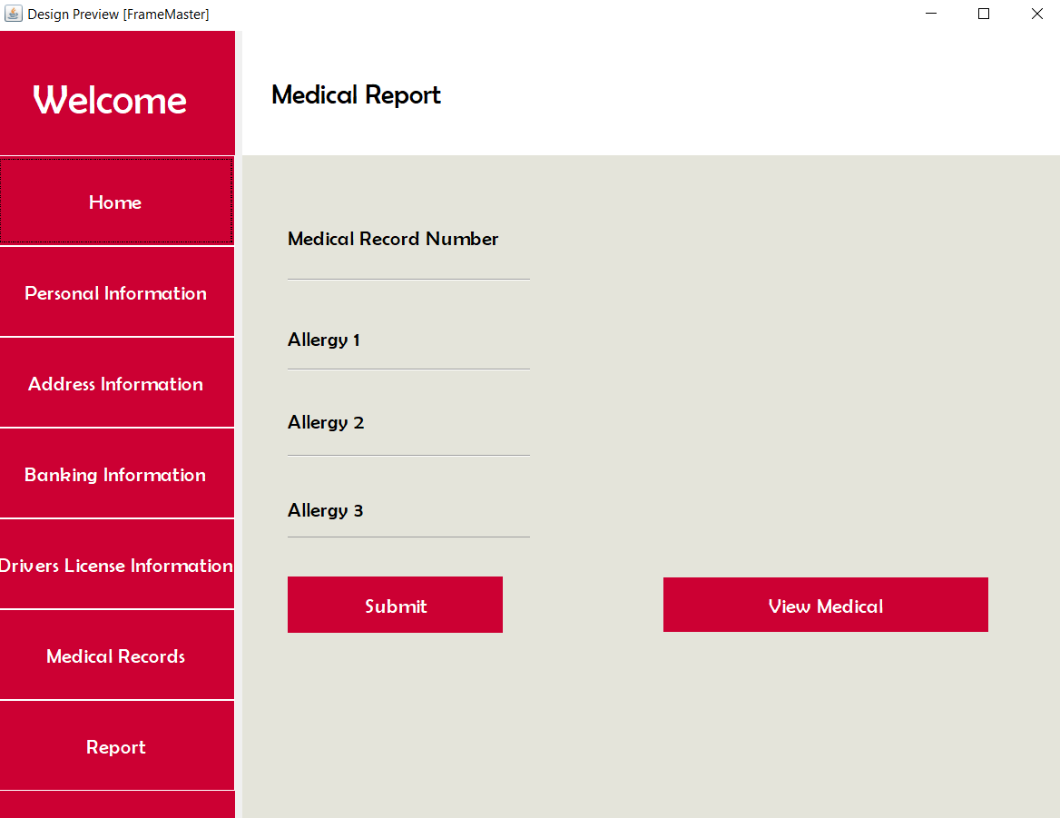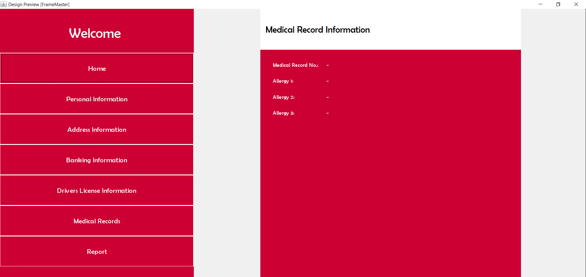 | Medical Information | Medical Record: Medical record number, Alergy1, Alergy2, Alergy3. |