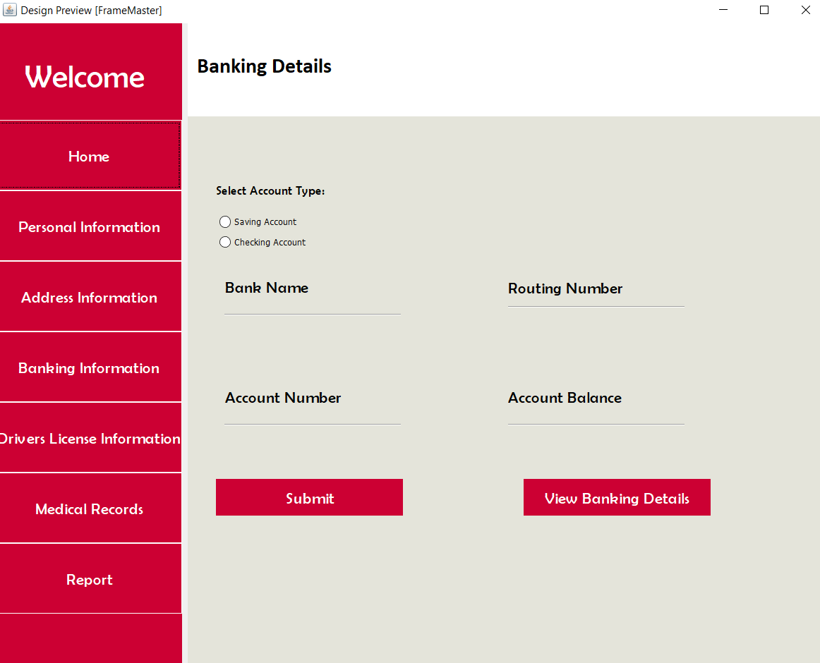 | Banking Information | Account information: Bank name, bank routing number, bank account number, account balance, account type |