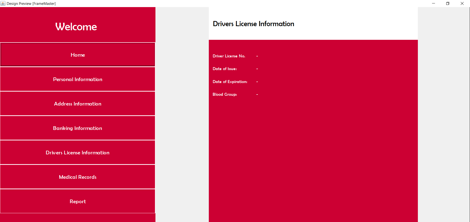 | Driver License Information | Driver’s license information: License number, date it was issued, date of expiration, blood type, and a picture. |