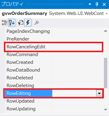 gvwOrderSummary_RowEditingmethod andgvwOrderSummary_RowCancelingEditmethod have been generated inOrderDetails.aspx.vb, implement as follows:Protected Sub gvwOrderSummary_RowEditing(sender As Object, e As System.Web.UI.WebControls.GridViewEditEventArgs) Handles gvwOrderSummary.RowEditing ' Switch gvwOrderSummary to edit mode Me.gvwOrderSummary.EditIndex = e.NewEditIndex Me.gvwOrderSummary.DataSource = DirectCast(Session("Orders"), System.Data.DataTable) Me.gvwOrderSummary.DataBind() ' Set primary key and foreign key columns as read only DirectCast(Me.gvwOrderSummary.Rows(e.NewEditIndex).Cells(1).Controls(0), TextBox).Enabled = False DirectCast(Me.gvwOrderSummary.Rows(e.NewEditIndex).Cells(2).Controls(0), TextBox).Enabled = False DirectCast(Me.gvwOrderSummary.Rows(e.NewEditIndex).Cells(3).Controls(0), TextBox).Enabled = False End Sub Protected Sub gvwOrderSummary_RowCancelingEdit(sender As Object, e As System.Web.UI.WebControls.GridViewCancelEditEventArgs) Handles gvwOrderSummary.RowCancelingEdit ' Switch gvwOrderSummary to display mode Me.gvwOrderSummary.EditIndex = -1 Me.gvwOrderSummary.DataSource = DirectCast(Session("Orders"), System.Data.DataTable) Me.gvwOrderSummary.DataBind() End Sub