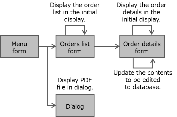 UpdateOrdermethod to update the details of specified order summary and order details information with the following code.Public Function UpdateOrder(orderParameter As OrderParameterValue) As OrderReturnValue ' Create an object of Return Value class Dim returnValue As New OrderReturnValue() ' Create an object of auto generated DAO classes Dim orderDao As New DaoOrders(Me.Dam) Dim orderDetailsDao As New DaoOrder_Details(Me.Dam) ' Create an object of DataTable to store order information and order details information Dim orderTable As System.Data.DataTable = orderParameter.Orders Dim orderDetailsTable As System.Data.DataTable = orderParameter.OrderDetails ' Judge the state of DataRow, and update database if DataRow is modified If orderTable.Rows(0).RowState = System.Data.DataRowState.Modified Then ' 注文情報(サマリ)更新用のパタメータを設定する orderDao.PK_OrderID = orderTable.Rows(0)("OrderId") orderDao.Set_OrderDate_forUPD = orderTable.Rows(0)("OrderDate") orderDao.Set_RequiredDate_forUPD = orderTable.Rows(0)("RequiredDate") orderDao.Set_ShippedDate_forUPD = orderTable.Rows(0)("ShippedDate") orderDao.Set_ShipVia_forUPD = orderTable.Rows(0)("ShipVia") orderDao.Set_Freight_forUPD = orderTable.Rows(0)("Freight") orderDao.Set_ShipName_forUPD = orderTable.Rows(0)("ShipName") orderDao.Set_ShipAddress_forUPD = orderTable.Rows(0)("ShipAddress") orderDao.Set_ShipCity_forUPD = orderTable.Rows(0)("ShipCity") orderDao.Set_ShipRegion_forUPD = orderTable.Rows(0)("ShipRegion") orderDao.Set_ShipPostalCode_forUPD = orderTable.Rows(0)("ShipPostalCode") orderDao.Set_ShipCountry_forUPD = orderTable.Rows(0)("ShipCountry") ' Update the order information to the database orderDao.D3_Update() End If For Each row As System.Data.DataRow In orderDetailsTable.Rows ' Judge the state of DataRow, and update database if DataRow is modified If row.RowState = System.Data.DataRowState.Modified Then ' Set the parameters of the order details information orderDetailsDao.PK_OrderID = row("OrderId") orderDetailsDao.PK_ProductID = row("ProductId") orderDetailsDao.Set_UnitPrice_forUPD = row("UnitPrice") orderDetailsDao.Set_Quantity_forUPD = row("Quantity") orderDetailsDao.Set_Discount_forUPD = row("Discount") ' Update the order details information to the database orderDetailsDao.D3_Update() End If Next ' Return result value Return returnValue End Function