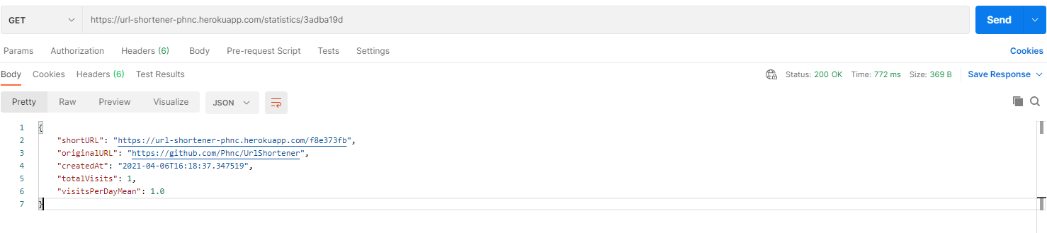 Another function available in this Url Shortener is to view the statistics behind a generated URL. When using this functionality, data such as total number of visits, date of creation and the mean of visits per day will be returned to the user.