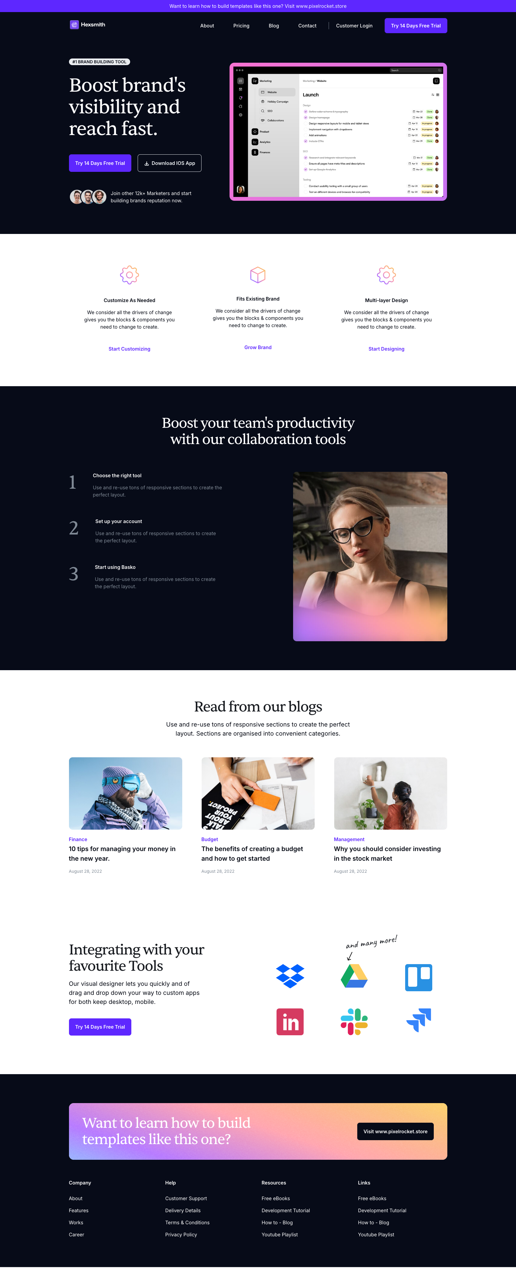 The Hexsmith HTML template is an elegant, modern, and fully responsive design crafted for businesses aiming to elevate their brand's online visibility and engagement. The template's sleek, dark-themed layout is punctuated with vibrant gradients and well-organized sections that draw attention to key features and services. The homepage is designed to make a strong first impression, featuring bold headlines, a call-to-action for a free trial, and an enticing visual of a user interface in action.