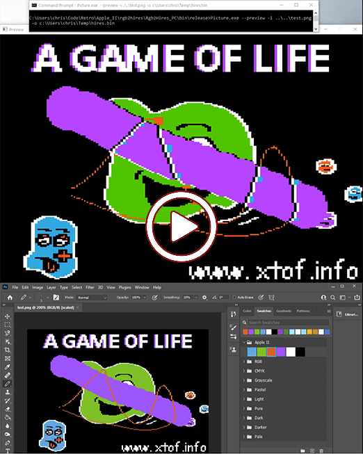 - Picture: a program to convert an RGB png to a binary or an ASM excerpt that can be loaded into the HIRES memory pages of an Apple II. An optional live preview can be displayed: its window will simulate an RGB monitor and will show the result, including color clashing and artifacts.