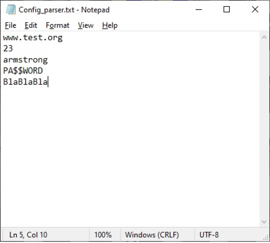 App demonstrate how to use text file as config data source. If app and text file with name identifical app name is on same directory, this app get five parameters from five text lines divided by new line and show on display.