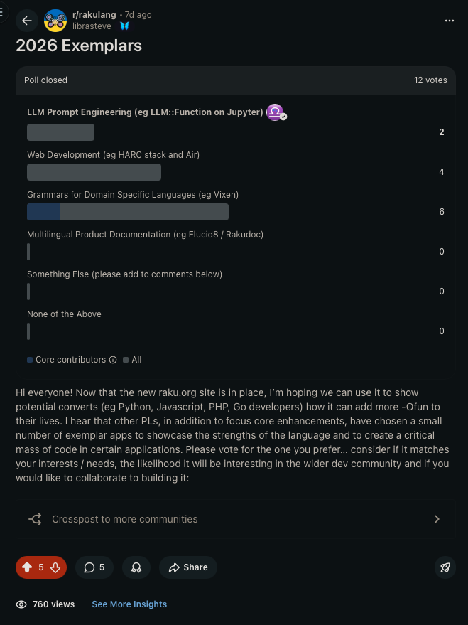 I have set myself a goal for 2026: - "interest & engage the next 1000 Raku coders". My thesis is, we need to pool resources and focus on a small number (1?) of exemplar applications that can be a showcase for our fantastic language.