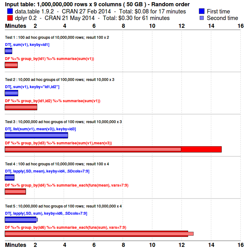 This would be great to investigate. Any volunteers? The time and space to create indexes vs the subsequent faster grouping times should be reported separately. data.table's setkey is like a clustered index in SQL. The key is the physical row order in RAM and is very L2/L3 cache efficient when grouping those columns. dplyr would also be faster on a data.frame if the groups are contiguous in RAM for the same reason. But recall that the benchmark's 5 queries are designed to test grouping in several different columns. So just one ordering or one index would be insufficient. This is why we're working on secondary keys (set2key) analogous to CREATE INDEX in SQL. Two types of SQL database should be tested: row-store and column-store. If they have in-memory options those should be selected since disk will always be slower than RAM. Both data.table and data.frame are in-memory column stores limited by RAM. 240GB is the biggest EC2 machine available currently which we used for these results. On the other hand, a database can of course can store and query many TB and the data can persist on disk.