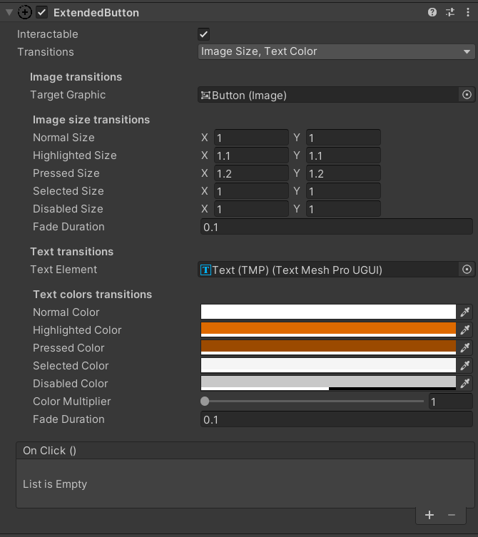 - After adding the Extended Button component, you can use it like a regular button and, since it inherits from Button, you can use all the original methods and fields.