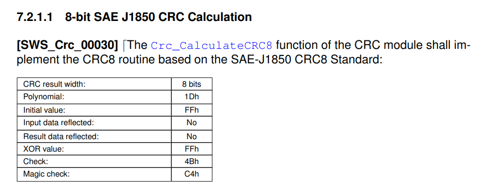 CRC-8-SAE J1850 uses polynomial 0x1D, but you have it right in your c-code. The only thing is J1850 doesn't specify how to present the data to the CRC algorithm. I am currently replacing the first byte with a Msg id instead of ignoring it. Here. I looked at BMW now. They started using CRC in F-series and the algorithm uses 9 bytes. I figured that they feed CRC with 1st and 2nd bytes of msg id and then 7 data bytes. This is the proper way to do it if we bother to use CRC at all, because it is easy for the controller to send correct data but with a wrong id. |