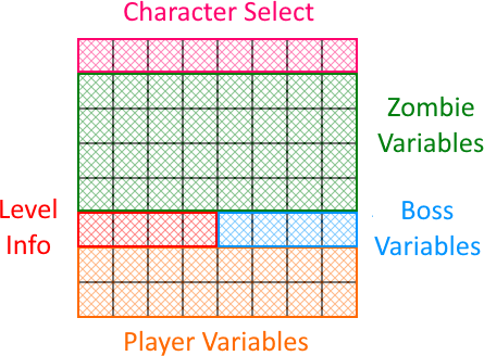 A 8x8 Custom Render Texture (CRT) with a feedback loop governs the interactions between players, zombies, and the boss. It also manages the states such as idle, attack, or knocked down that results from such interactions. Originially, I had everything inside a single CRT with the depth sorting done by a radix sort. However the performance was poor on the Quest, so I took up Merlin's advice to seperate the sprites into individual quads and composite it with a camera. The Quest performant version is the one setup for in this project.- Download the .zip or the Unity package in Release