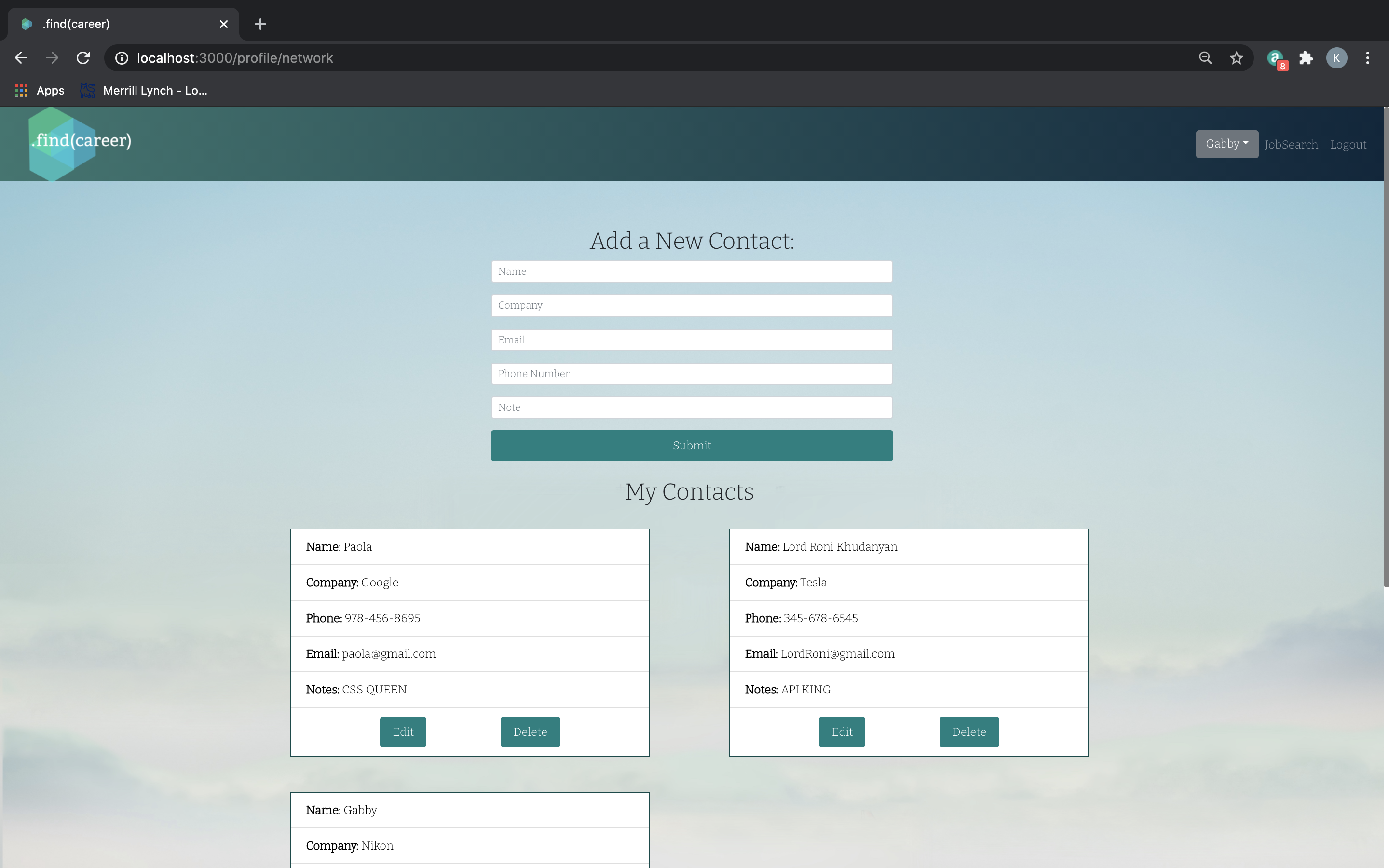 | GET | /findnetwork | Shows all our saved contacts on our network page |