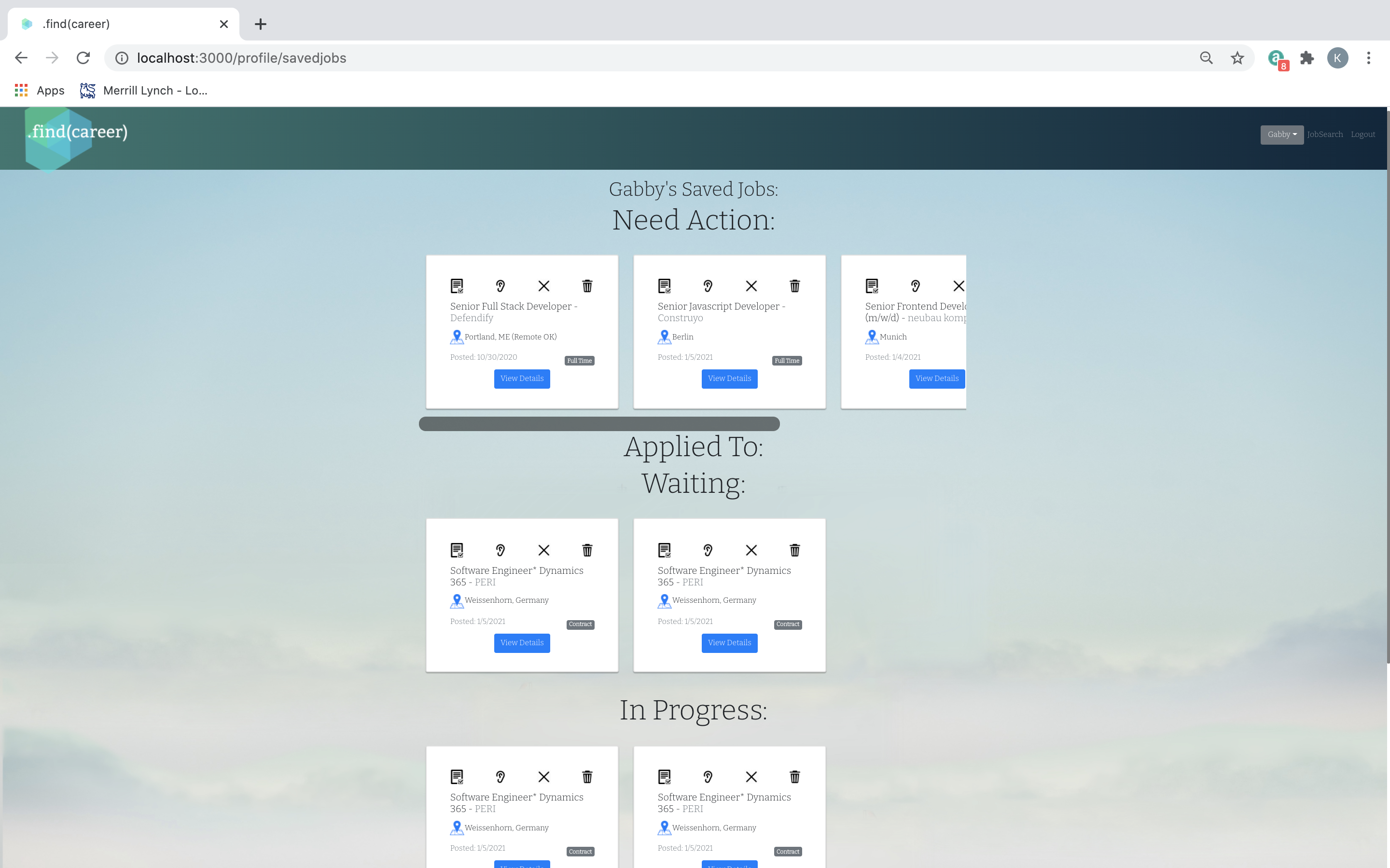 | SavedJob | jobId, location, language, company, jobTitle, heardBack:{status,scheduledInterview, closed}, appliedTo:{appstatus, date, notes[]} |