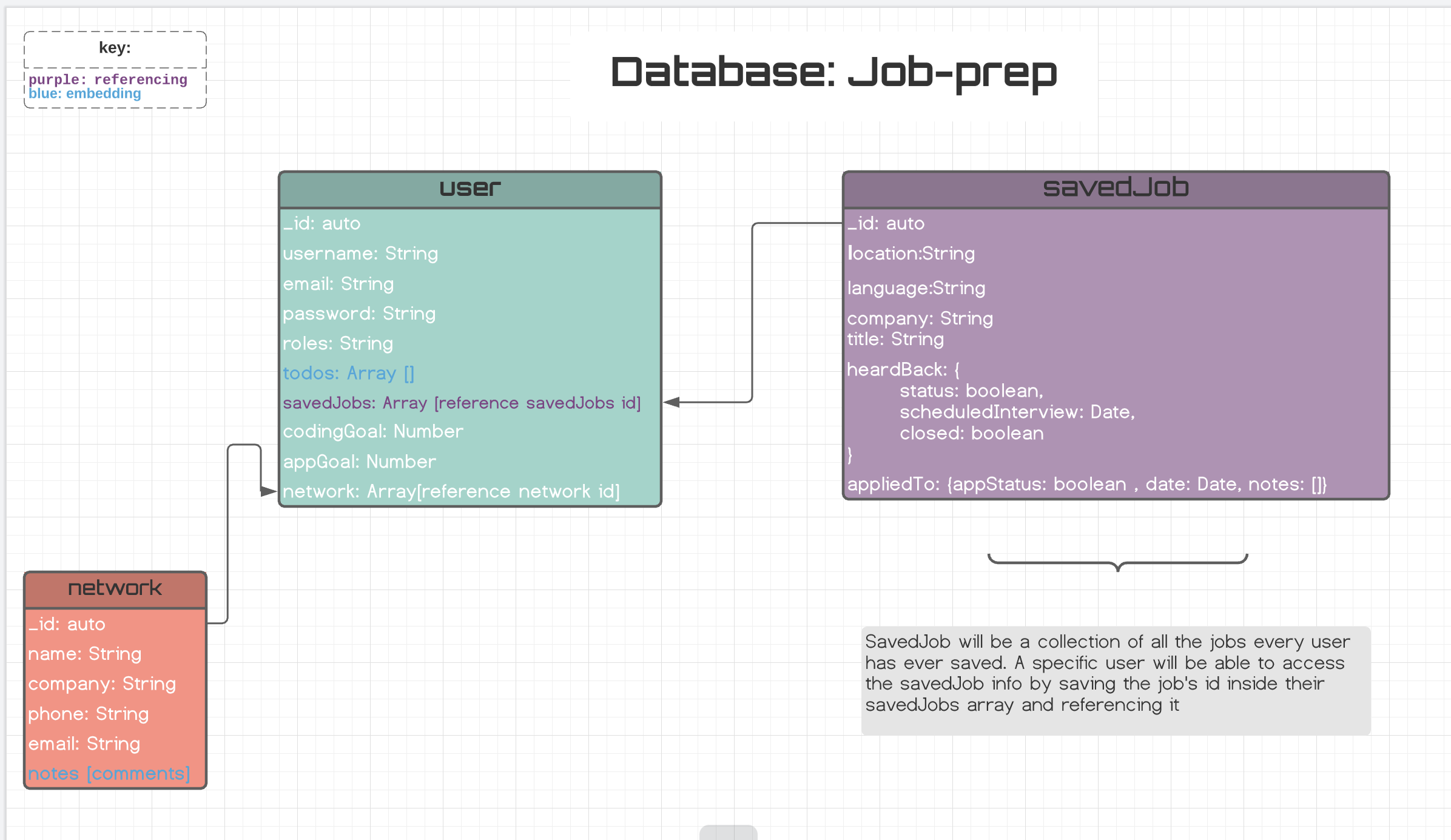 | User | username, email, password, roles:[{ref:Role}], todos[], savedJobs:[{SavedJob}], codingGoal:{goal,progress}, appGoal{goal,progress}, network[{ref:Network}] |