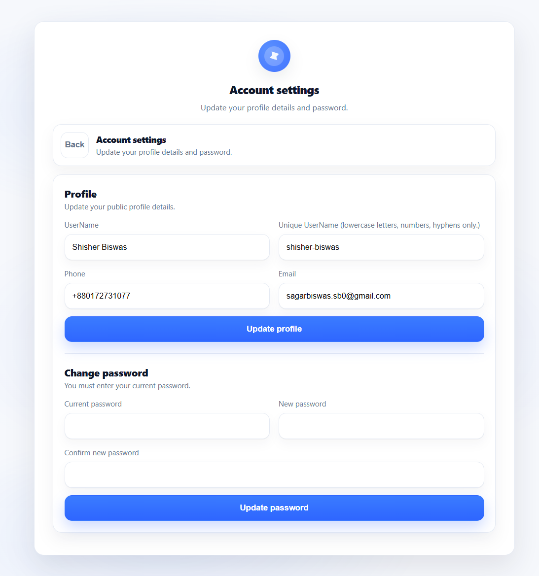 - Account settings (update profile + change password)