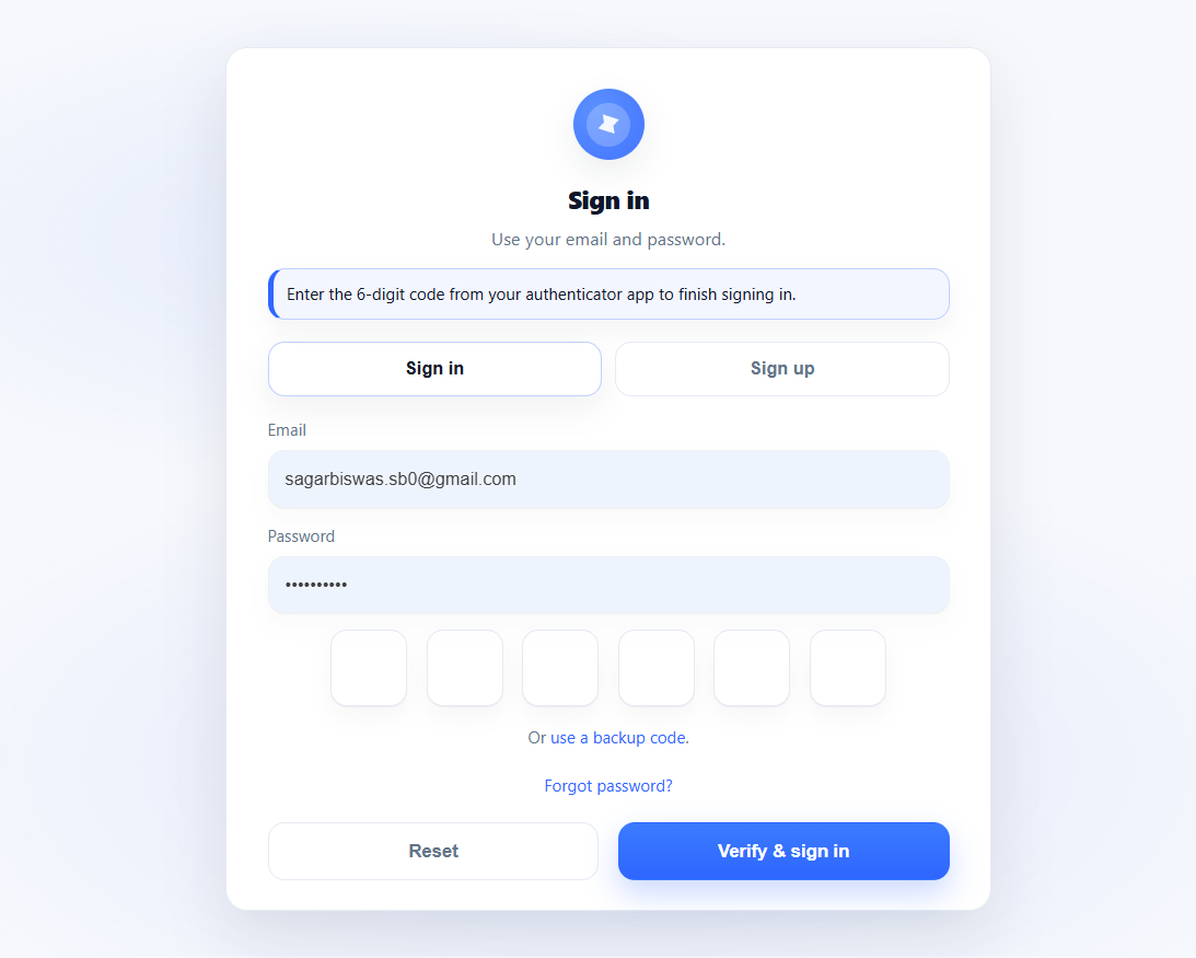 sagar-biswas) - Enter email → Send code → enter the 4-digit OTP