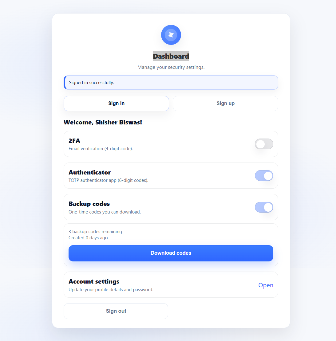 - Sign in with optional 2FA:
