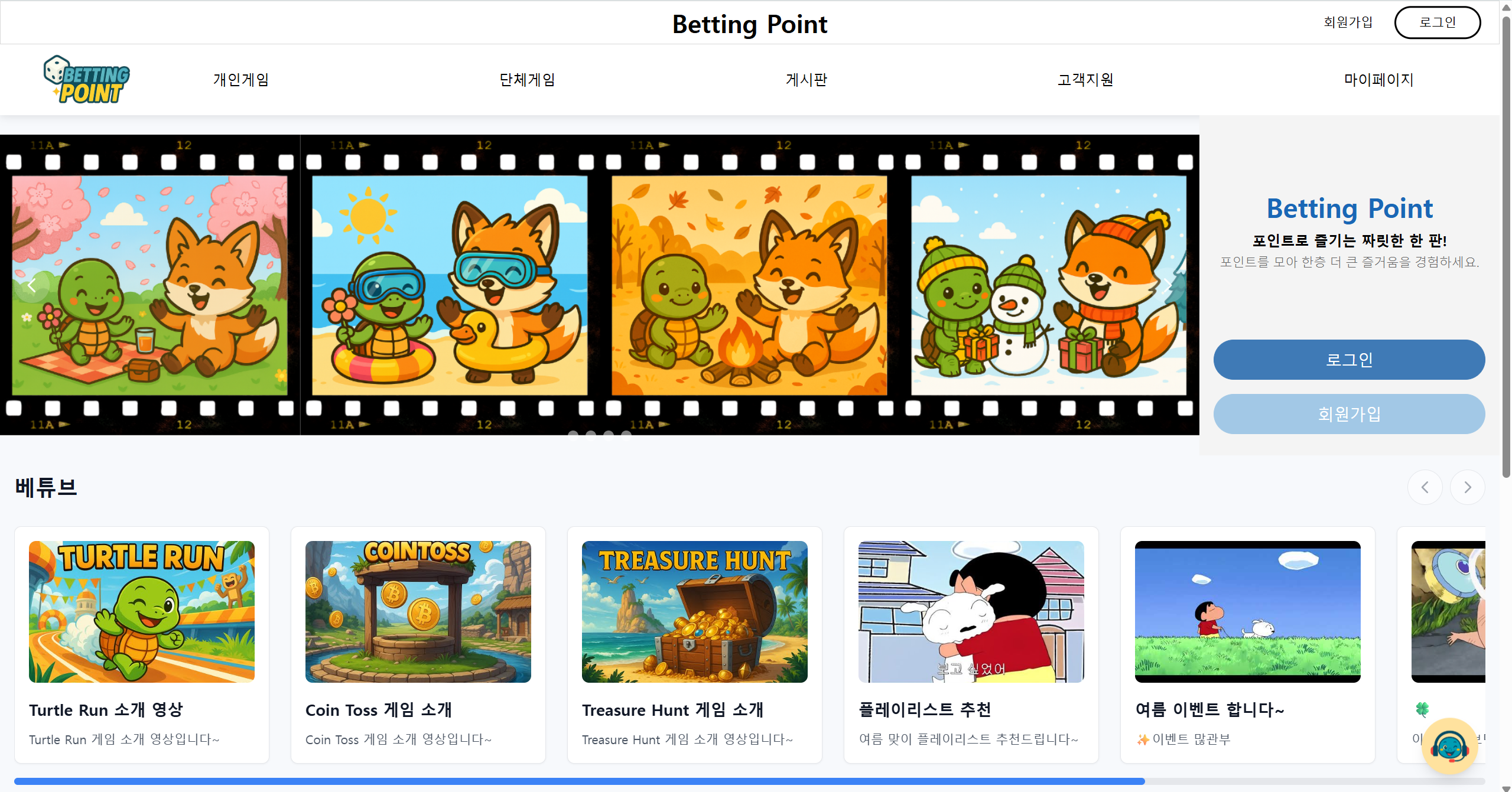 Betting Point는 사용자들이 포인트를 사용해 재미있게 배팅 게임을 즐길 수 있도록 기획된 금융형 배팅 플랫폼입니다.