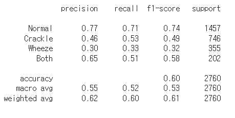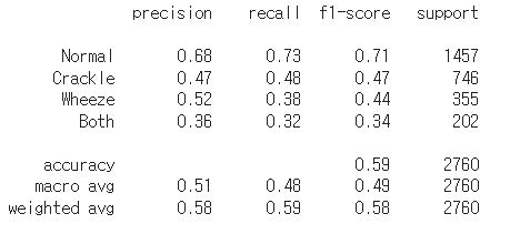 - Smart_padding 을 구현하여 train셋으로 활용하여 훈련한 결과, wheezing & crackle sound가 둘 다 있는 both class에 대해 높은 recall & f1-score를 보였으나, wheezing class에 대해서 점수가 낮아지는 것을 확인하였습니다.