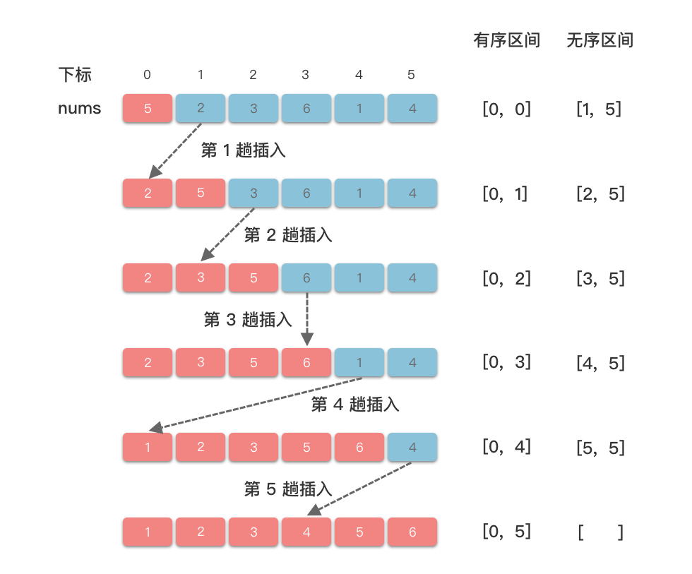 - 初始状态下,有序区间为