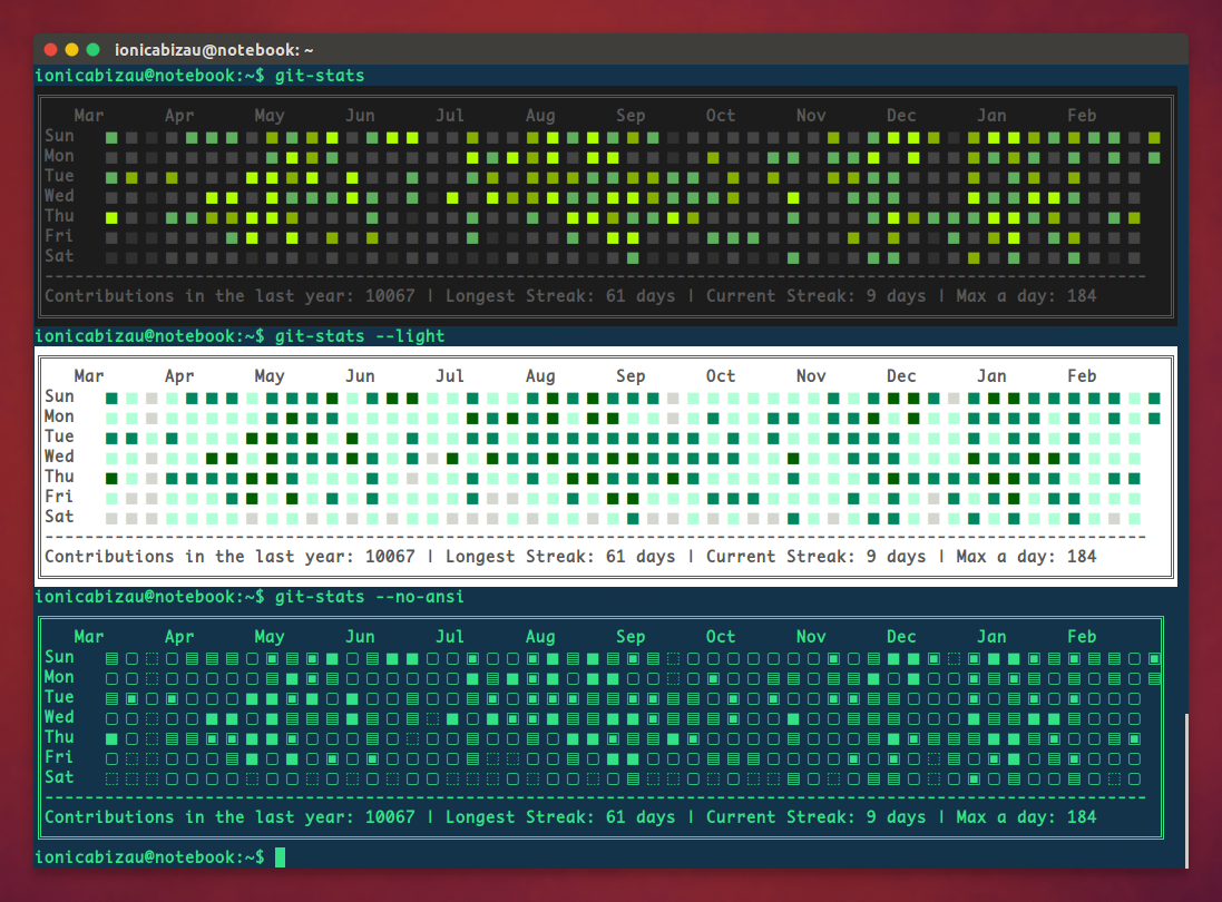 git-stats # Displays your commit calendar
