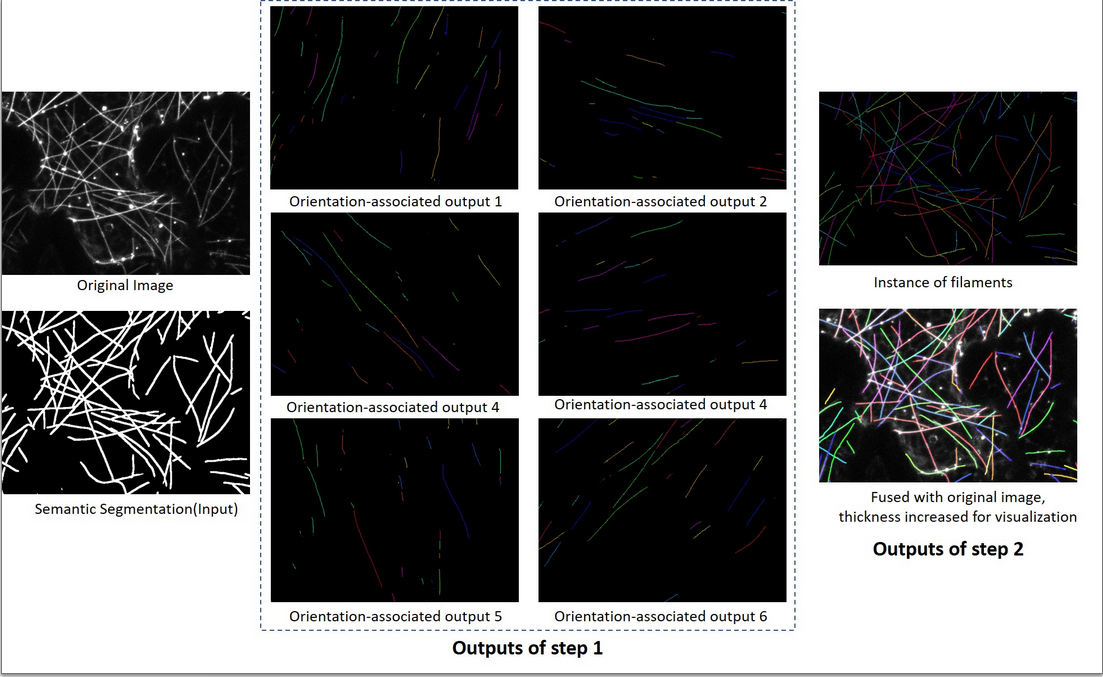 This project includes segmenation, seperation, reconnection three steps as stated in the paper. The proposed method aovid reconnecting filaments at intersection and thus acheives a better result than existing methods.