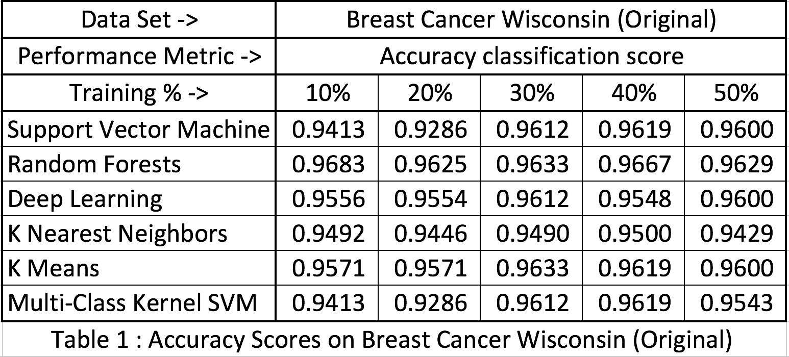 Data from all our datasets under consideration in divided into training and testing, ranging from 10% training / 90% testing to 50% training / 50% testing. After fitting the model onto the training set, we compare the prediced class labels from the test set to the actual class labels. The Accuracy Scores: