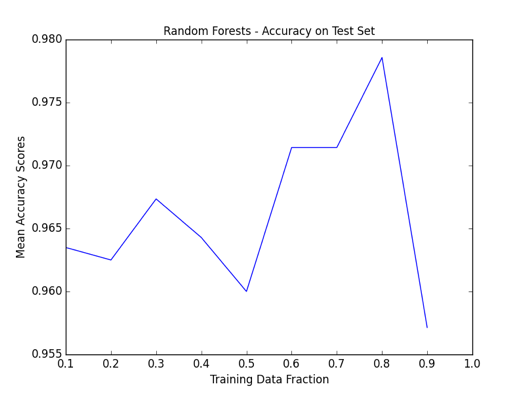 The datasets are divided into training sets and testing sets, ranging from 10% training / 90% testing to 50% training / 50% testing. The estimator and max_depth values are chosen based on the best accuracy score. We fit the Random Forests classifier on the training data and then apply it to test data. The performance metric used is the normalized accuracy_score. In this metric, the set of labels produced must exactly match the corresponding set of labels in its input. The associated plot is displayed.
