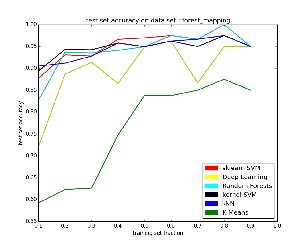 Forest dataset: The model is trained using rmspropagation optimizer with a batch size of 32, sigmoid activation of dense layer and categorical cross entropy (log loss) as objective function as this is a multiclass classification. There are 512 neurons in the hidden layer. The model is trained for 20 epochs.