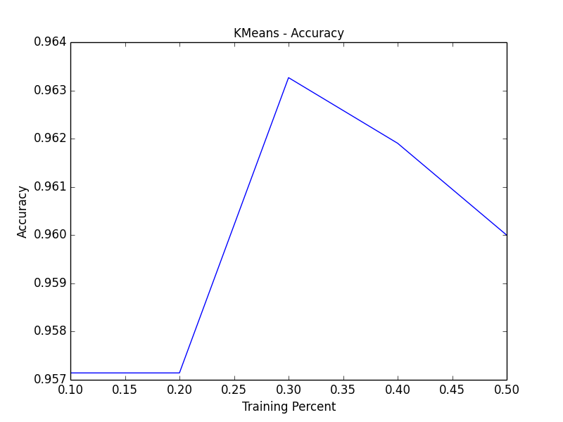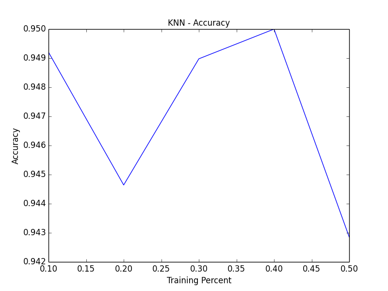 The accuracy vs. above training/test data percentages on the same dataset is plotted above.