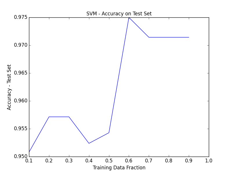 The datasets are divided into training sets and testing sets, ranging from 10% training / 90% testing to 50% training / 50% testing. The C Value is chosen from the results of the crossvalidation to obtain the highest accuracy score. We fit the SVM model on the training data and then apply it to test data. The performance metric used is the normalized accuracy_score. In this metric, the set of labels produced must exactly match the corresponding set of labels in its input. The associated plot is displayed.