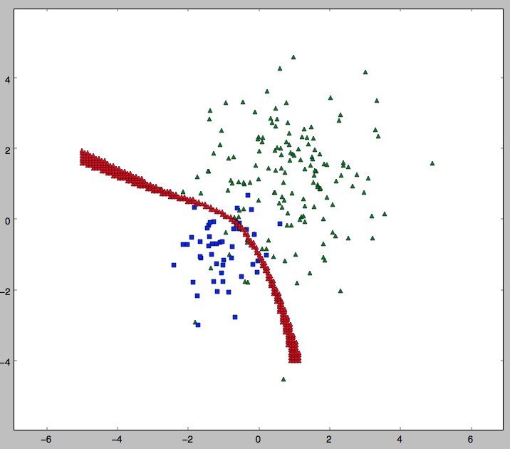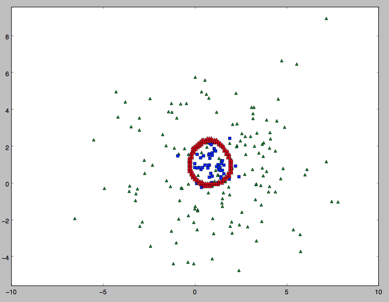 To show that our implementation was indeed kernalized, we ran a visual experiment using two-class Gaussian data. The blue and green points are the data colored by their classes. The points in red describe points that are very close to the splitting surface generated by the two-class kernel SVM (using a Gaussian kernel with