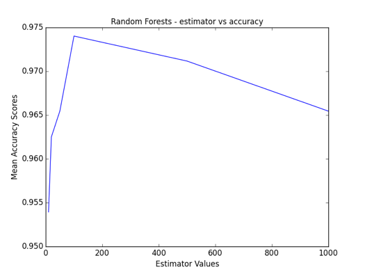 i) n_estimators: n_estimators represent the number of trees in the forest. In general, the more the number of trees, the better the results. However, after a certain point, the improvement decreases as the number of trees increases. This is because the benefit in prediction performance from learning more trees will be lower than the cost in computation time for learning these additional trees. Here we have tested estimator values ranging from 10 to 1000.