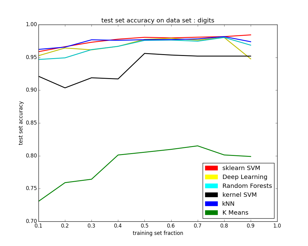 We ran the multi-class kernel SVM implementation on multiple data sets. On the handwritten digit data set, our implementation takes a very long time to run (for train percentage less than 0.7 it runs in a moderate amount of time). To see the results from the other data sets, run the code.